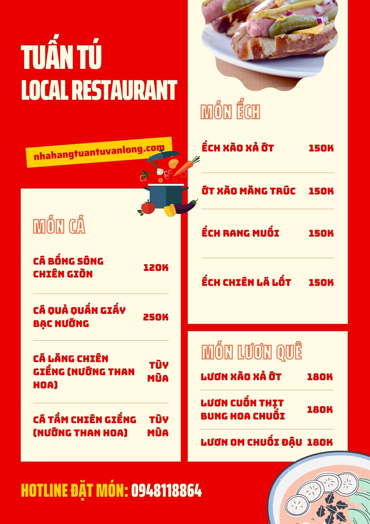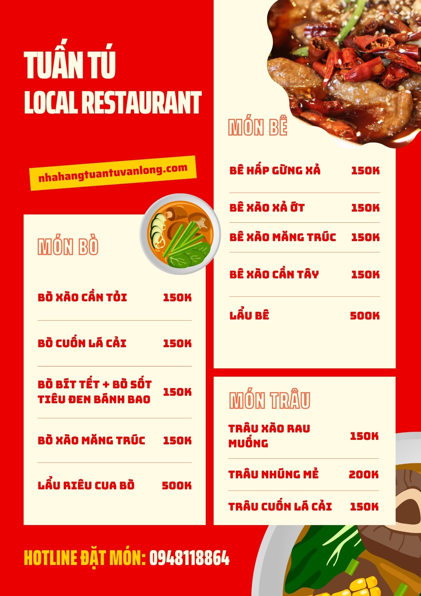 Nhà hàng Tuấn Tú Vân Long Ninh Bình xin gửi quý khách hàng Menu món ăn, giá cả có thể tăng giảm 1 chút theo mùa ạ: